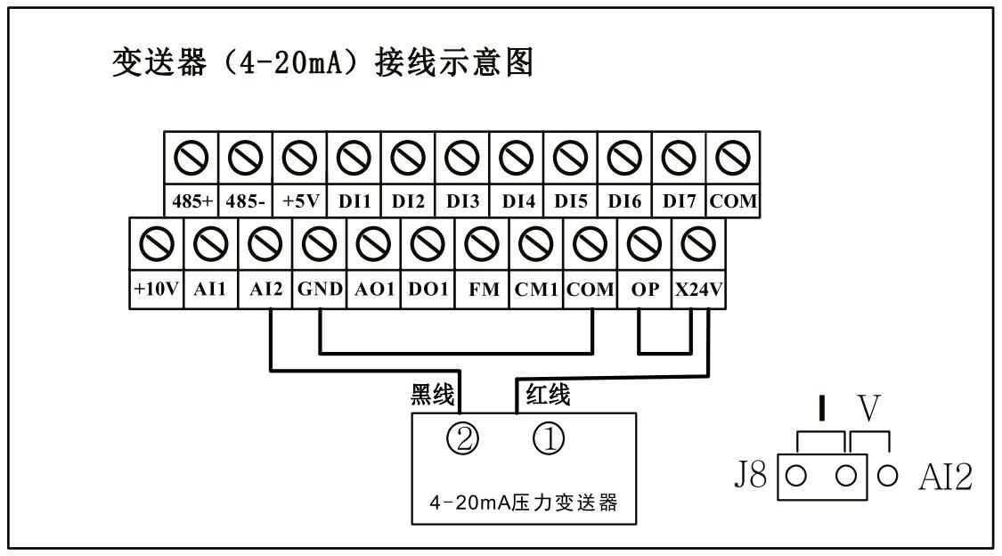 4-20mA變送器反饋模式,需要把綠色端子上的GND和COM用導線短接,變送器的正端接X24V(或者和X24V短接的OP),信號線接AI2。如下圖所示。